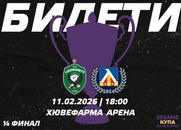 ПФК Лудогорец съобщава на своите фенове, че в понеделник (9 февруари) ще са в продажба билетите за 1/4-финала на Sesame Купа България срещу Левски. Мачът ще се играе на 11 февруари (сряда) от 18,00 ч. на стадион "Хювефарма Арена" в Разград.