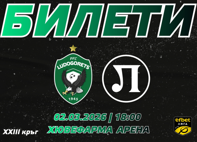ПФК Лудогорец съобщава на своите фенове, че вече са в продажба билетите за мача от ХXIII кръг на efbet Лига срещу Локомотив (Пловдив). Двубоят ще се играе на 2 март (понеделник) от 18,00 ч. на стадион "Хювефарма Арена" в Разград.