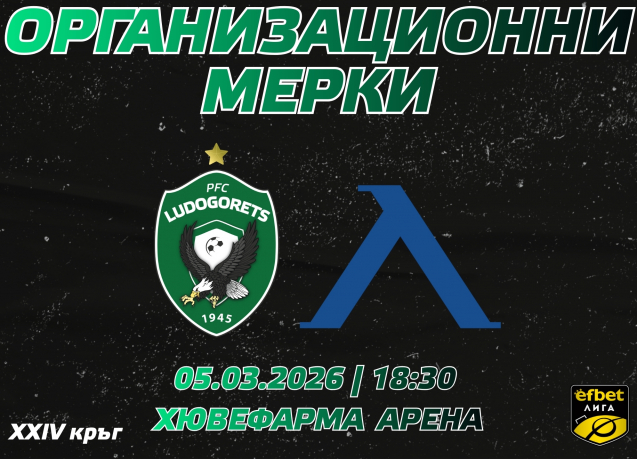 ПФК Лудогорец уведомява всички фенове, които ще гледат на живо днешния мач срещу Левски от XXIV кръг на efbet Лига, че стадион „Хювефарма Арена“ ще отвори врати в 16:30 ч. Двубоят започвя два часа по-късно - в 18:30 ч.