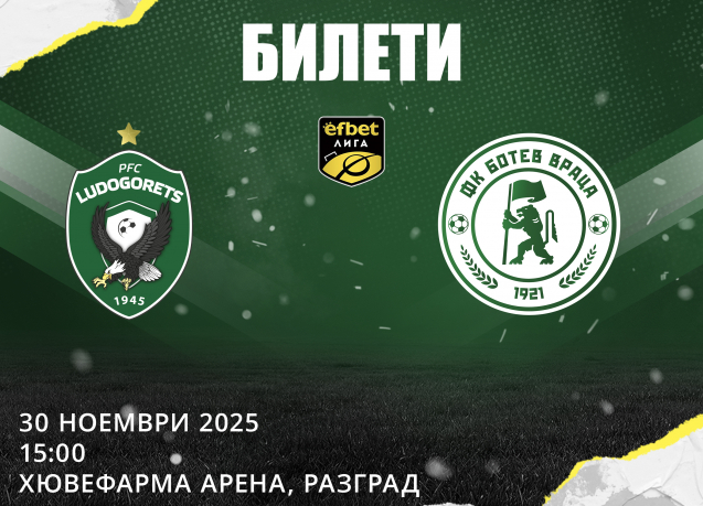 ПФК Лудогорец съобщава на своите фенове, че вече са в продажба билетите от XVII кръг на efbet Лига с Ботев (Враца) . Мачът ще се играе на 30 ноември (неделя) от 15,00 ч. на стадион „Хювефарма Арена“ в Разград.