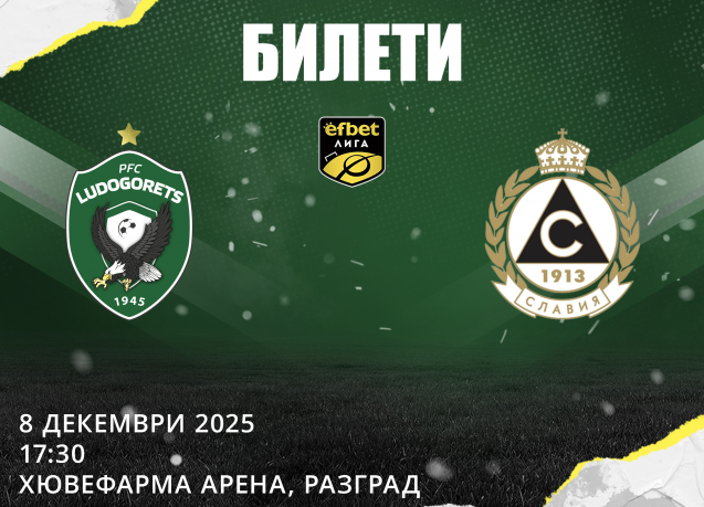 ПФК Лудогорец съобщава на своите фенове, че вече са в продажба билетите от XIX кръг на efbet Лига със Славия. Мачът ще се играе на 8 декември (понеделник) от 17,30 ч. на стадион "Хювефарма Арена" в Разград.