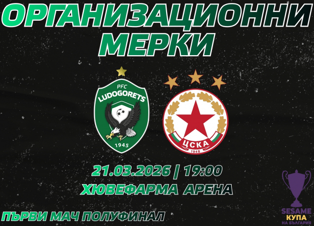 ПФК Лудогорец уведомява всички фенове, които ще гледат на живо днешния мач срещу ЦСКА от полуфиналите на турнира за Купата на България, че стадион „Хювефарма Арена“ ще отвори врати в 17:00 ч. Двубоят започвя два часа по-късно - в 19:00 ч.
